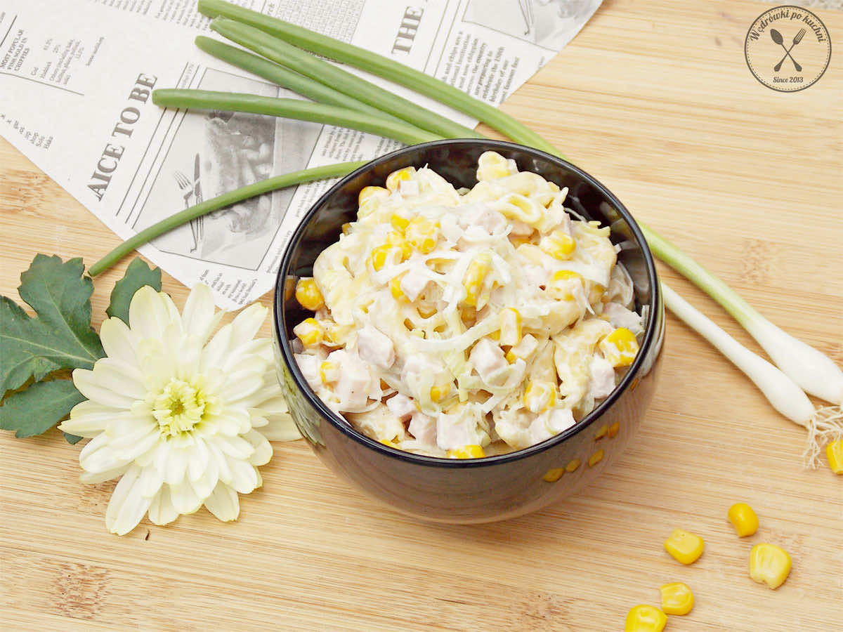 Jedna z kultowych i szybkich sałatek, które goszczą na niejednej imprezie. Jej przygotowanie jest bardzo proste i szybkie. Robi się ją z zupek Vifon kurczak curry ze względu na specyficzny ostry smak, który właśnie ta sałatka powinna posiadać. Nigdy nie robiłam jej z innych zupek, dlatego ciężko powiedzieć czy będzie równie dobra.