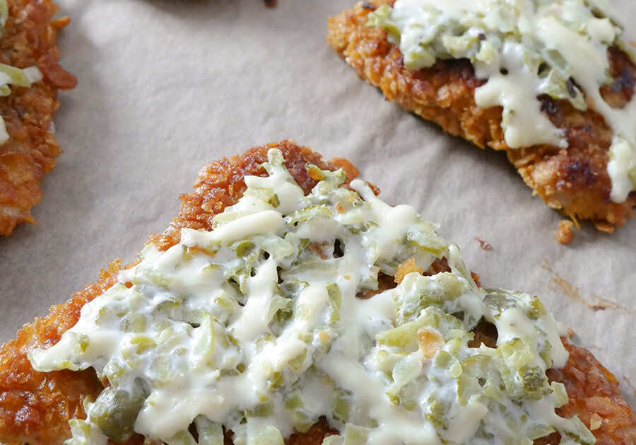 Chrupiące i aromatyczne kotlety z kurczaka pod pierzynką z żółtego sera i ogórka konserwowego.