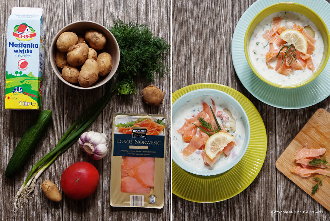 Młode ziemniaki. Koper. Kefir albo maślanka. Chyba od zawsze to najprostszy i najszybszy obiad jaki znam i bardzo lubię. A gdyby tak pokombinować, dodać więcej składników, więcej smaku, a może i wędzoną rybę? Nakombinowałam. Wyszło pysznie.