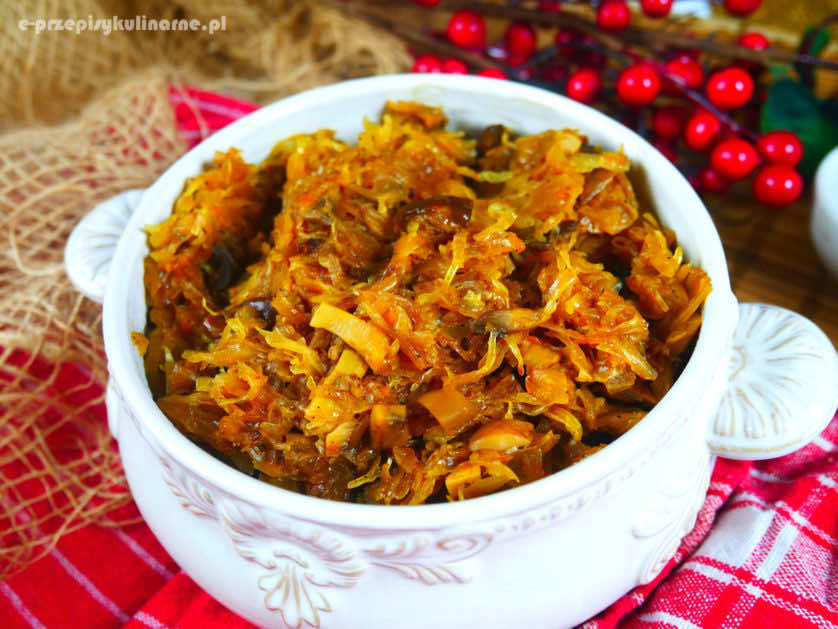 Bigos wigilijny czyli postna kiszona kapusta z dodatkiem grzybów, śliwek i pieczarek to pyszne danie, które serwujemy jako jedną z dwunastu potraw. Taki bigos gotuje się szybko i nie potrzeba kilku dni na jego przygotowanie.