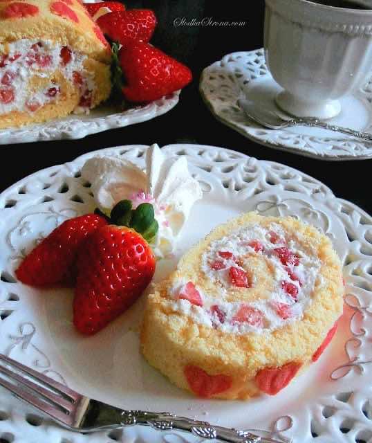 Biszkoptowa rolada z bitą śmietaną, aromatycznymi truskawkami i pokruszonymi bezami to prosty, delikatny a zarazem wyrazisty, wyjątkowy w smaku deser. Dodatkowo na biszkopcie możemy „namalować” urocze serduszka, które idealnie wkomponują się w miłosną atmosferę Walentynkowego wieczoru (lub romantycznej kolacji).