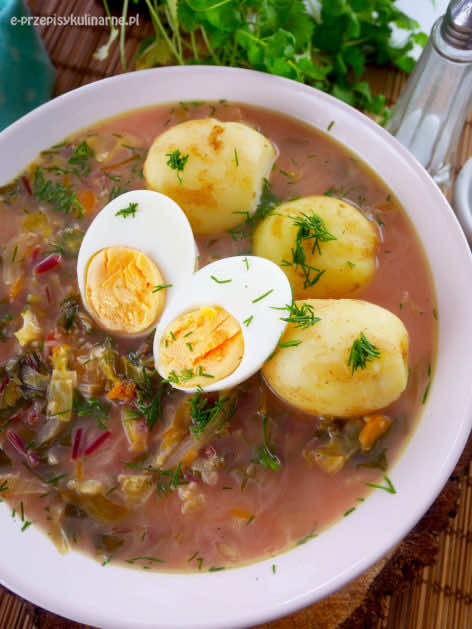 Botwinka z młodą kapustą, koperkiem i marchewką, podana z jajkiem gotowanym na twardo i młodymi ziemniaczkami to prawdziwie pyszna, lekka, ale sycąca zupa, idealna na późnowiosenny i letni obiad.