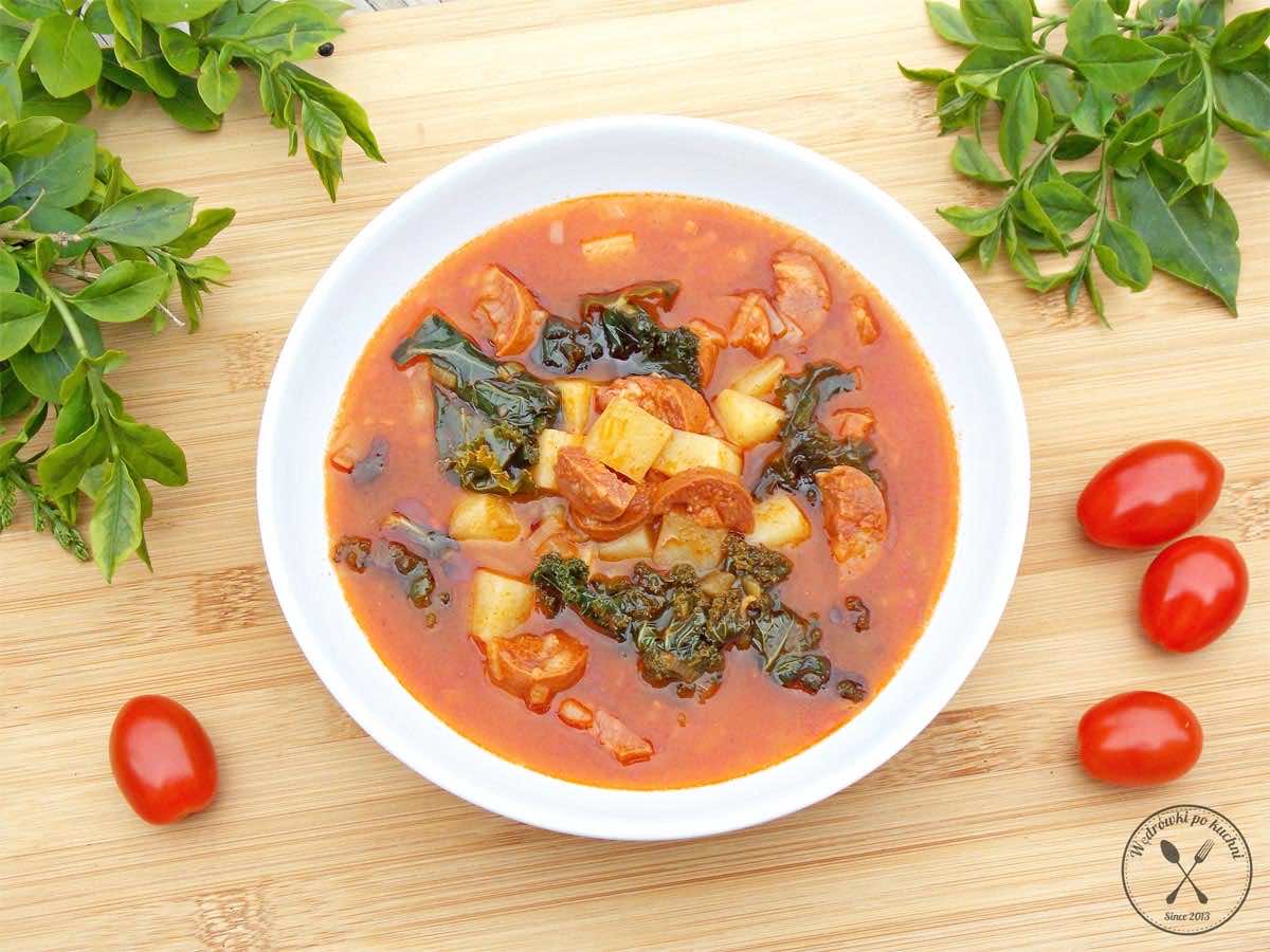 Dodatkowo jednym z głównych składników jest tradycyjna, lekko pikantna, portugalska kiełbasa chorizo. Na portugalskich stronach próbowałam odszukać kanoniczną wersję tej zupy, jednak taka nie istnieje. Dominują dwie podstawowe wersje: z czosnkiem, ziemniakami i oliwą dodaną pod koniec bądź też z czosnkiem, cebulą, pomidorami i chorizo podsmażonym na wstępie, zalanym bulionem. Wybrałam tę drugą wersję. Zupa jest bardzo pożywna, konkretna i smaczna.