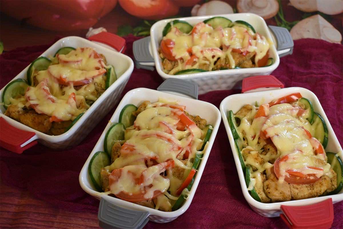 5. Ogórka kroimy w plasterki. Układamy na około mięsa, pomidory w pół plasterki, paprykę w paski, układamy na mięsie
