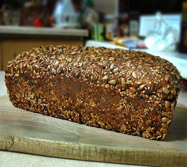 Prosty chleb żytni z niewielkim dodatkiem mąki pszennej i dużą ilością ziaren słonecznika, sezamu i siemienia lnianego.