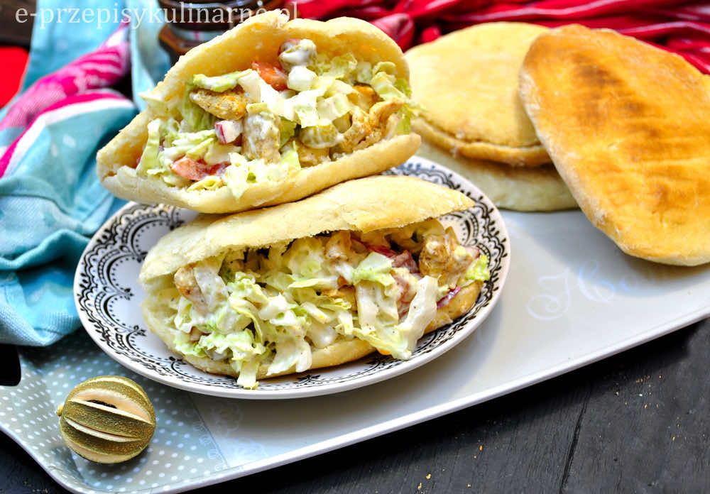 Przepis na chlebki pita wypełnione sałatką z kapusty pekińskiej i kurczaka. Pyszny, domowy fast-food.