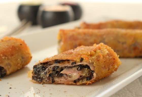 Na plasterku szynki rozprowadzić farsz i ścisło zawinąć. Obtoczyć w jajku i bułce tartej a następnie podsmażyć na mocno rozgrzanym oleju.