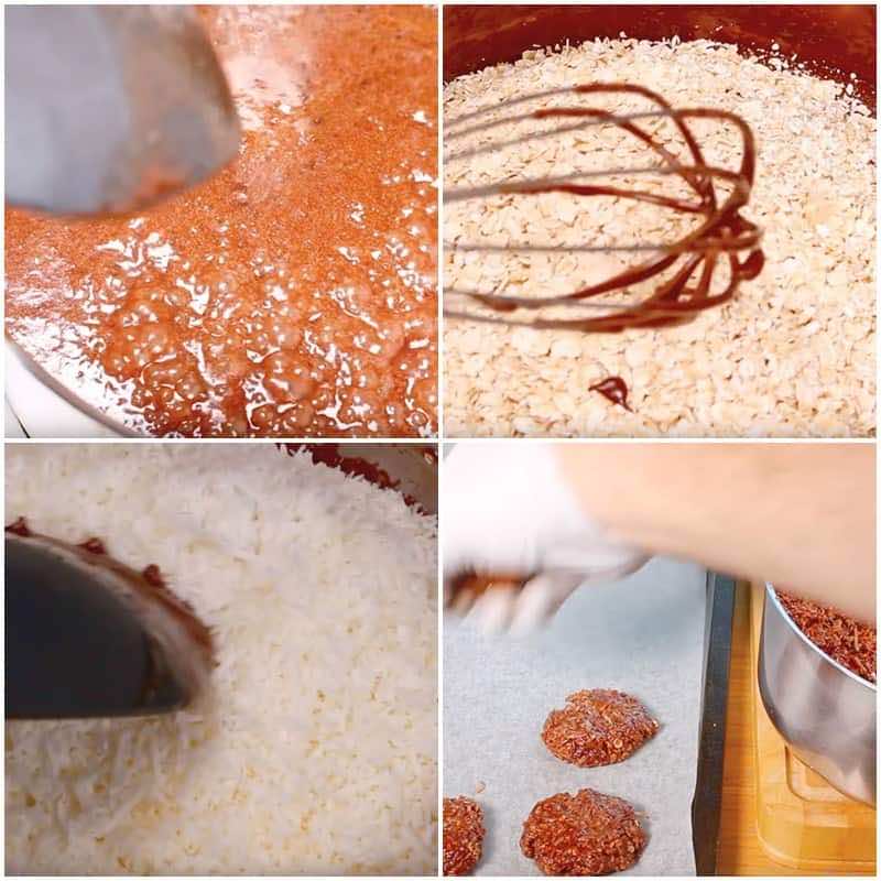 - Poczekaj gdy masa trochę ostygnie i ulep z niej ciasteczka rozkładając na papierze do pieczenia