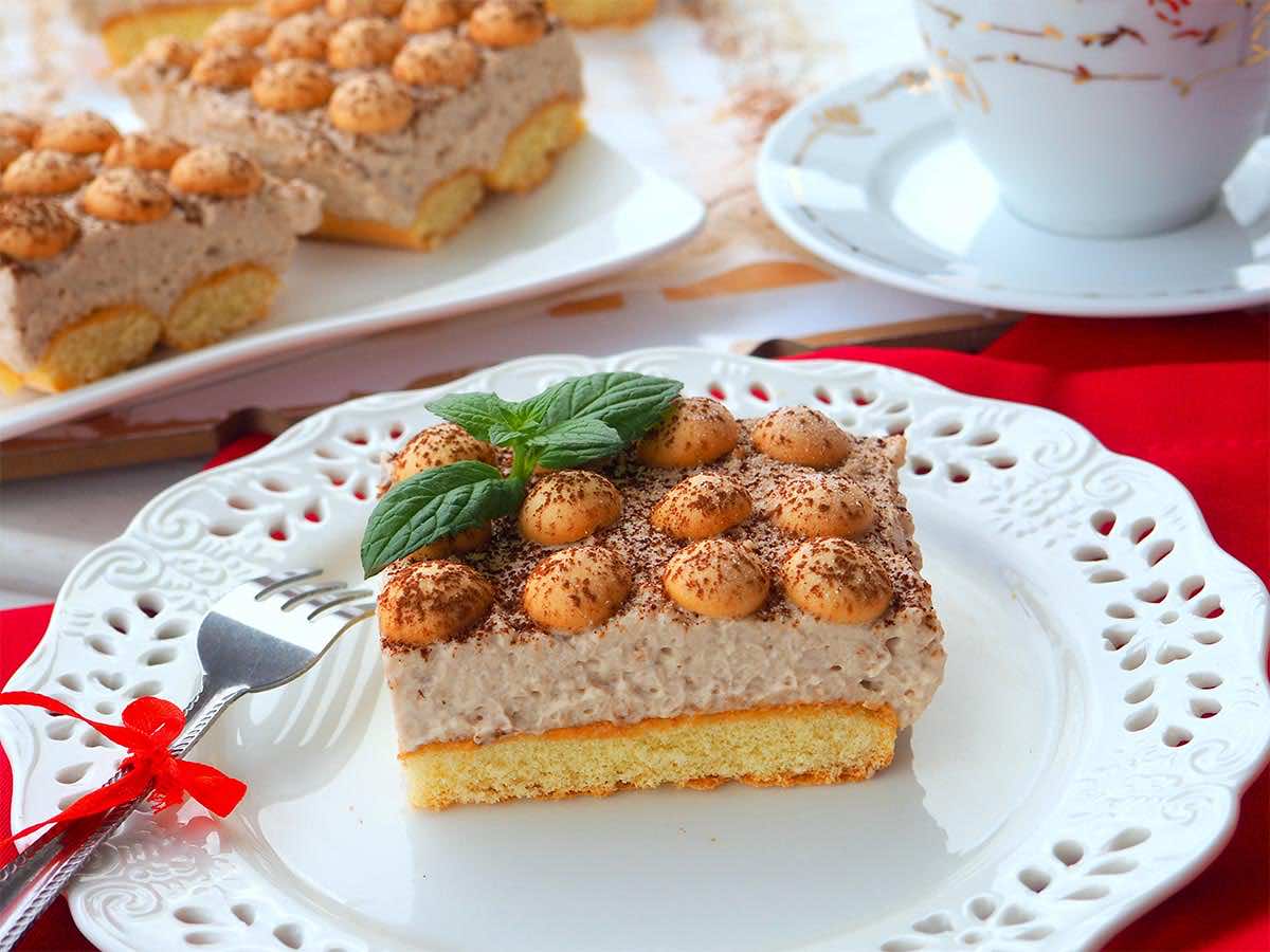 Sernik na zimno o smaku cappucinno, wykonany z prawdziwego twarogu z dodatkiem śmietanki kremówki, na podłużnych i kruchych biszkoptach.