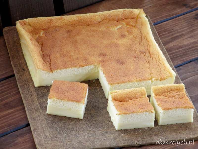 Bardzo nietypowe ciasto – z jednej masy podczas pieczenia robią się dwie warstwy tworząc część biszkoptową i budyniową.