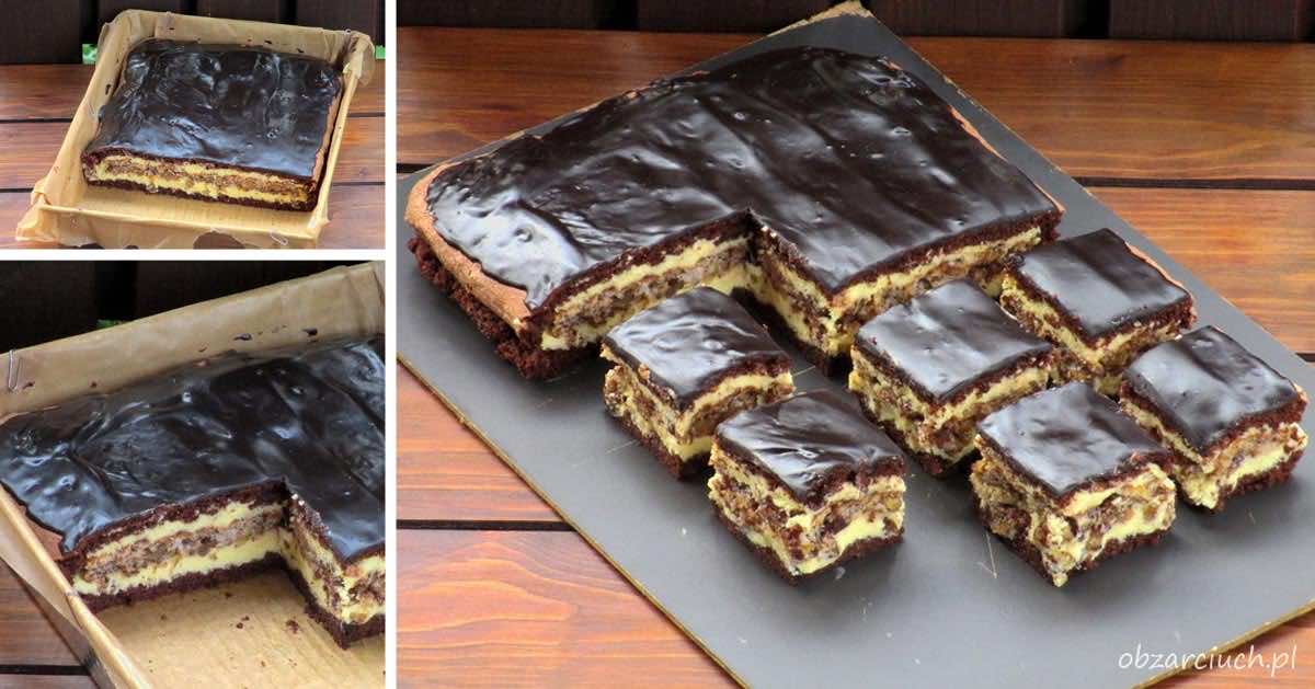 Delikatny czekoladowy biszkopt przełożony warstwą orzechową i kremem budyniowym. Ciasto inspirowane przepisem Siostry Anastazji.
