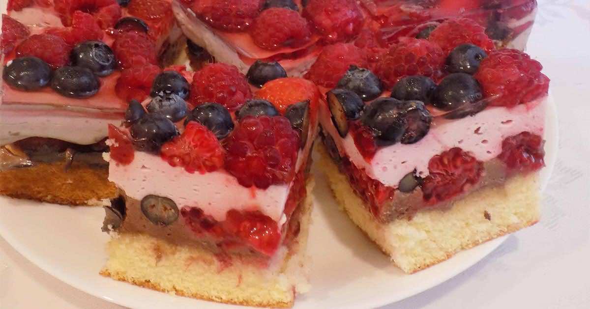 Delikatne i bardzo smaczne ciasto owocowe przekładane kremem czekoladowym na bazie nutelli i mascarpone. Następną warstwą jest krem śmietankowy o delikatnym posmaku malinowym, a całość zwieńczona jest galaretką z owocami. Bardzo proste w przygotowaniu, każdy sobie z nim poradzi.