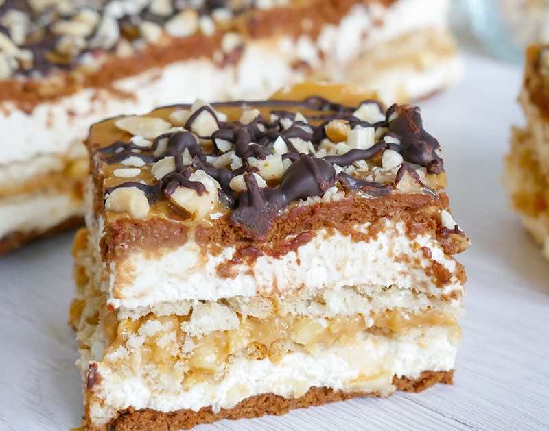 Ciasto snickers wzorowane na dobrze każdemu znanym batoniku z dużą ilością orzechów i masy krówkowej. Ta smaczna i słodka przekąska przygotowana jest w wersji bez pieczenia.