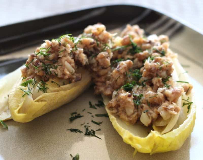 Na każdą połówkę cykorii nałożyć masę i posypać koperkiem.