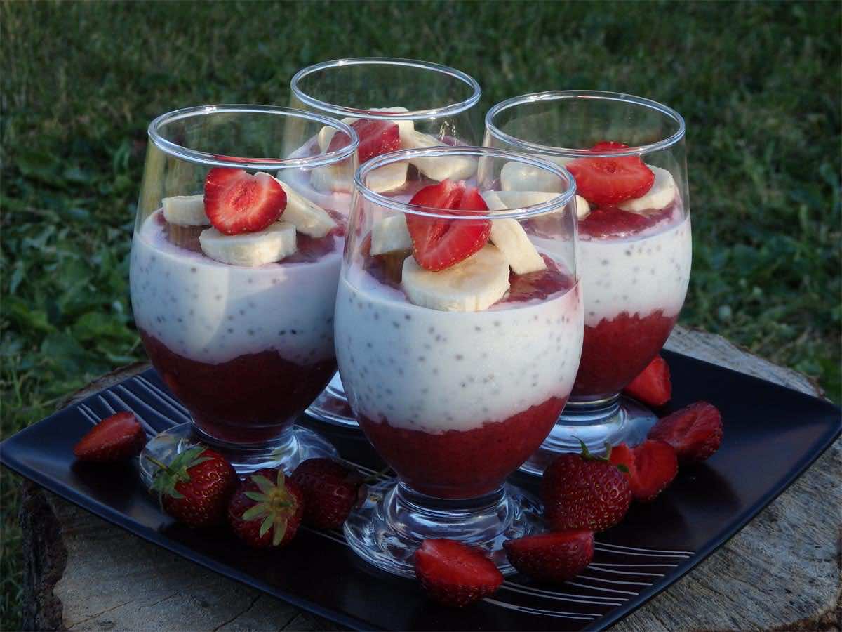 Kolejny deser z użyciem chia. Najbardziej lubię łączyć nasionka z jogurtem naturalnym i tak tez zrobiłam i w tym deserze. A do tego zmiksowane owoce-truskawki i banany i pyszny deser gotowy.