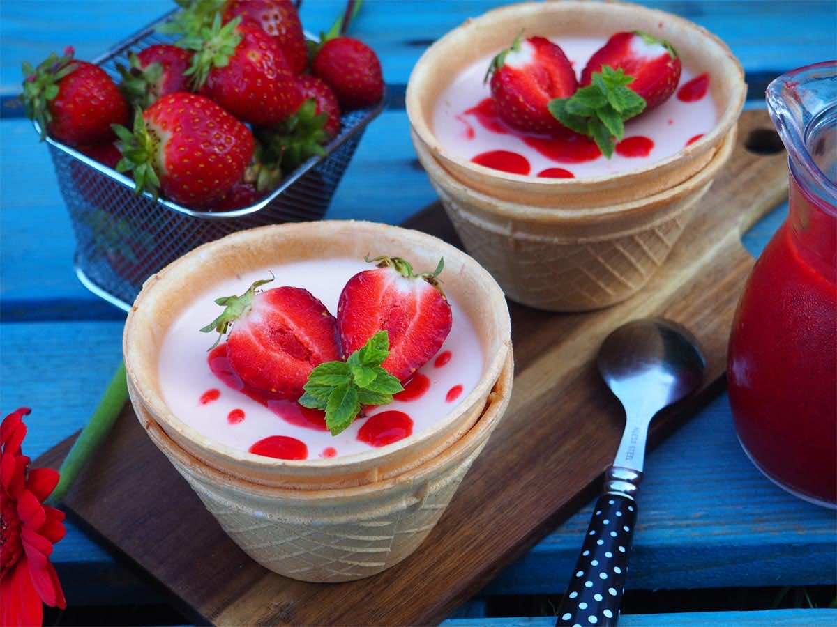 Deser o smaku cytynowo-truskawkowym -coś na wzór pana cotta – podany w miseczkach waflowy oraz musem truskawkowym.
