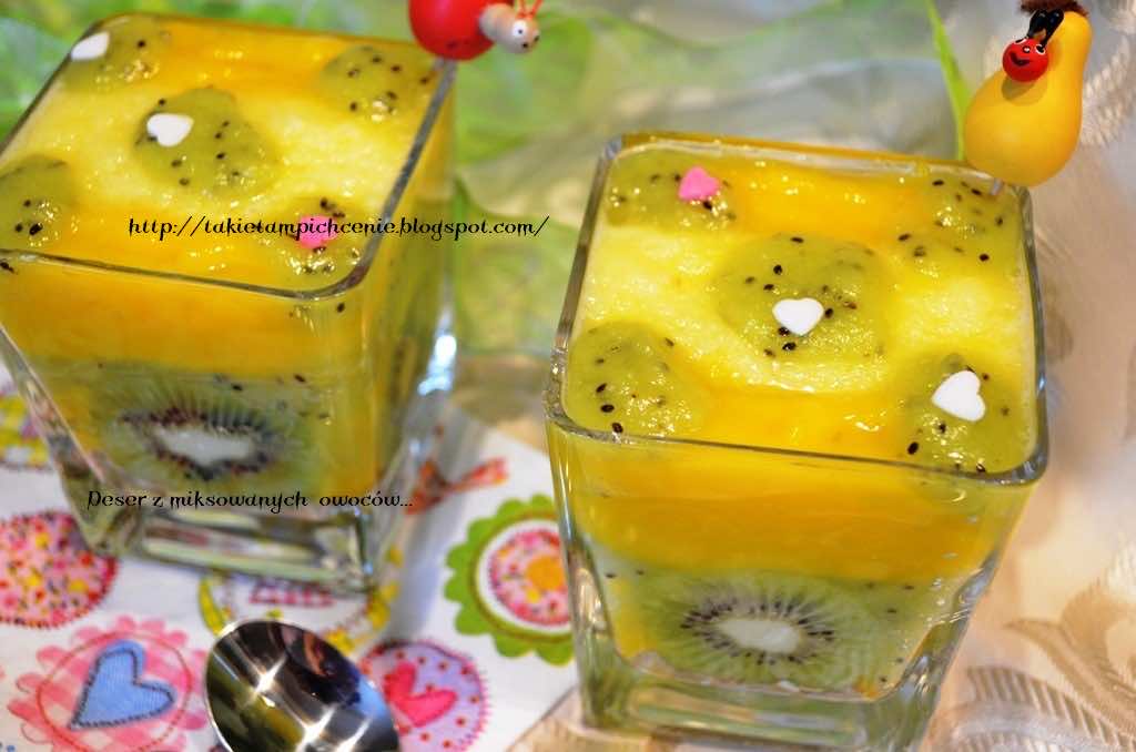 Pyszny, zdrowy i pożywny deser. Zmiksowane owoce mango, kiwi, ananas i banan, dodatkiem są płatki zbożowe. To deser dla diabetyków, wegan i osób dbających o zdrowie.