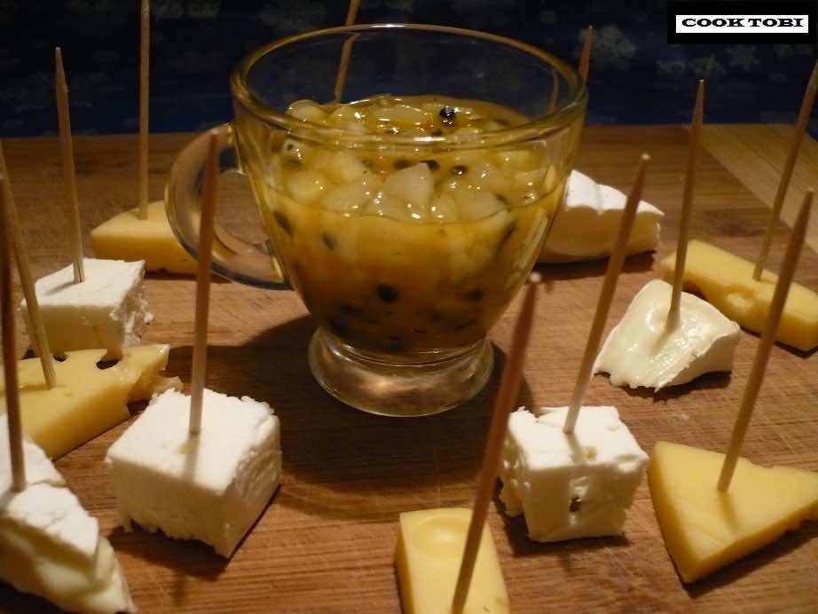 To najprostsza przekąska jaką możemy na szybko przygotować, lecz to co najważniejsze w desce serów to sos w którym zamoczymy nasze pyszne sery. Jeżeli żurawina Wam już bokiem wyłazi to polecam Wam eksplozję smaku w postaci sosu z marakui i gruszek z lekką nutą mięty. Świeża marakuja jest dostępna w każdym większym markecie i czasem jej cena jest tak mała że żal nie spróbować. Ten niepozorny owoc to skarbnica bardzo intensywnego smaku, tuż po rozcięciu owocu mamy pestki zaklęte w żelu który swoją konsystencją idealnie nadaje się na sos. Zaopatrzcie się w intensywne smakowo sery i wykałaczki i zachwyćcie znajomych pysznym sosem!