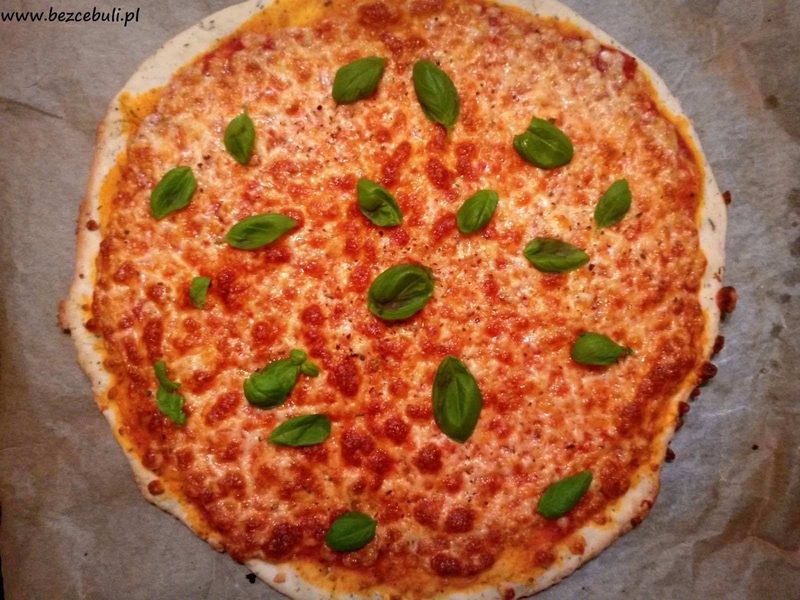 8. Upieczoną pizzę podajemy ze świeżą bazylią. Zamiast sosu polecam oliwę z oliwek lub oliwę smakową.