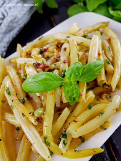 Fasolka szparagowa do obiadu z czosnkiem, natką pietruszki i suszonymi pomidorami to pyszny i aromatyczny dodatek do obiadu albo samodzielna przekąska. Robi się ją bardzo szybko, a smakuje wybornie.