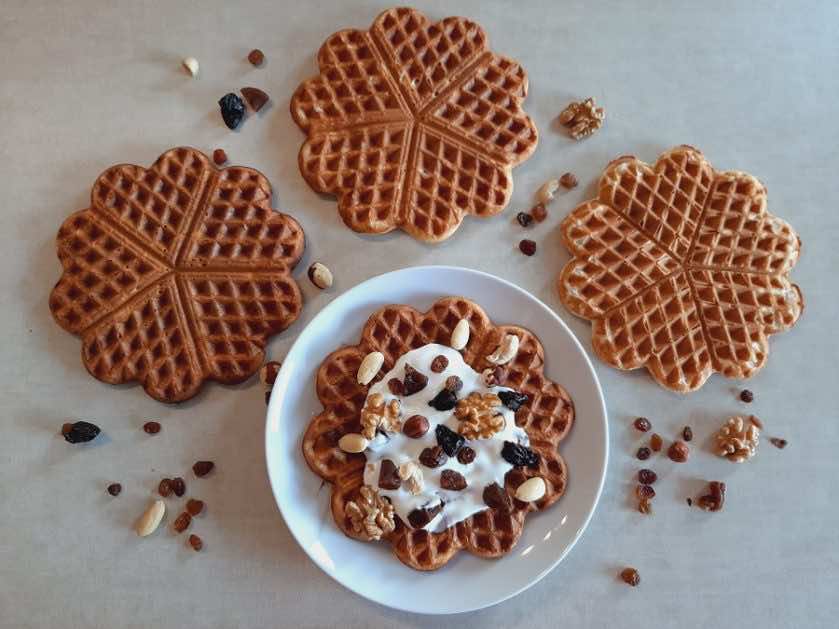 Gofry na maślance z dodatkiem mąki pełnoziarnistej i cukru trzcinowego to zdrowsza alternatywa dla popularnych gofrów. Smakują równie wyśmienicie i można je wcinać na śniadanie, kolację lub poczęstować gości. Rewelacyjnie smakują polane jogurtem greckim, syropem daktylowym lub konfiturą oraz posypane orzechami i suszonymi owocami.