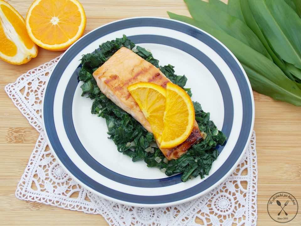 Czosnek niedźwiedzi – prawdziwy cud natury i właściwie pierwsza nowalijka, która pojawia się w lasach już w marcu. Sezon jest dość krótki, więc staramy się go dobrze wykorzystać, dlatego pędzę do Was z kolejnym przepisem. Dziś będzie wyjątkowo smacznie i zdrowo! Bohaterem tego dania jest grillowany łosoś, muśnięty marynatą pomarańczową. Podany na wspaniałym, aromatycznym duszonym czosnku niedźwiedzim. Danie zdecydowanie skradło nasze serca i z pewnością posmakuje nie tylko smakoszom dzikiej kuchni.