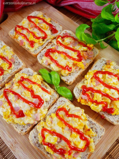 Kanapki na ciepło z jajecznicą, szynką i serem żółtym zapieczone w piekarniku to szybka i wyjątkowo smaczna przekąską, którą można podać na śniadanie czy kolację. Robi się je błyskawicznie – wystarczy usmażyć jajka, wymieszać je z szynką, serem i majonezem, nałożyć na chleb tostowy i zapiec w piekarniku.