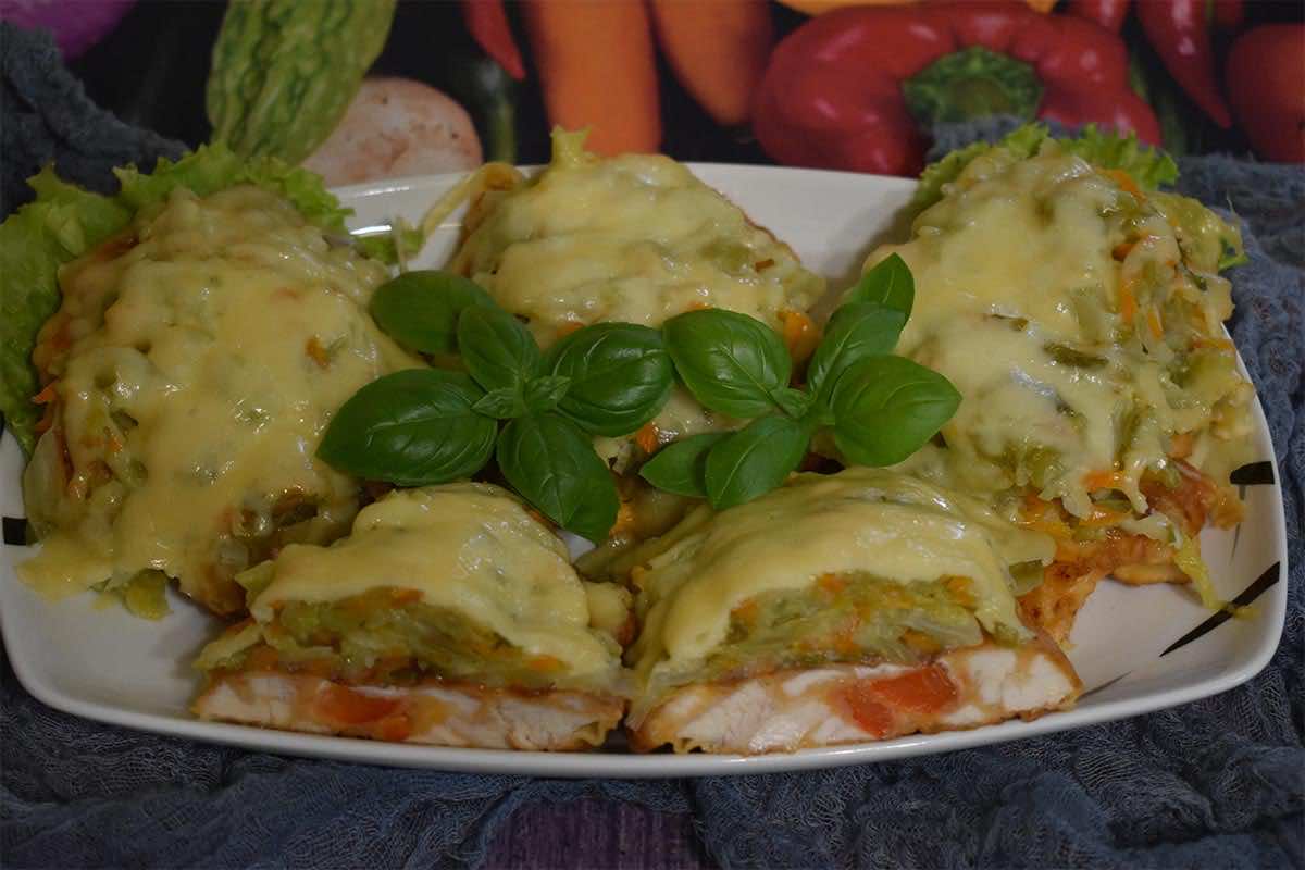 Siekane drobiowe kotlety z papryką, przykryte młodą kapustą, zapiekane w piekarniku.