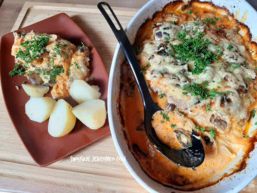 Szukacie pomysłu na pyszny obiad który przygotuje cię w kilka minut, więc to właśnie jest danie dla was. Pyszna karkówka z pieczarkami zapieczona w sosie z majonezu z ketchupem. Przygotowanie to maksymalnie 10 minut plus pieczenie. Polecam.