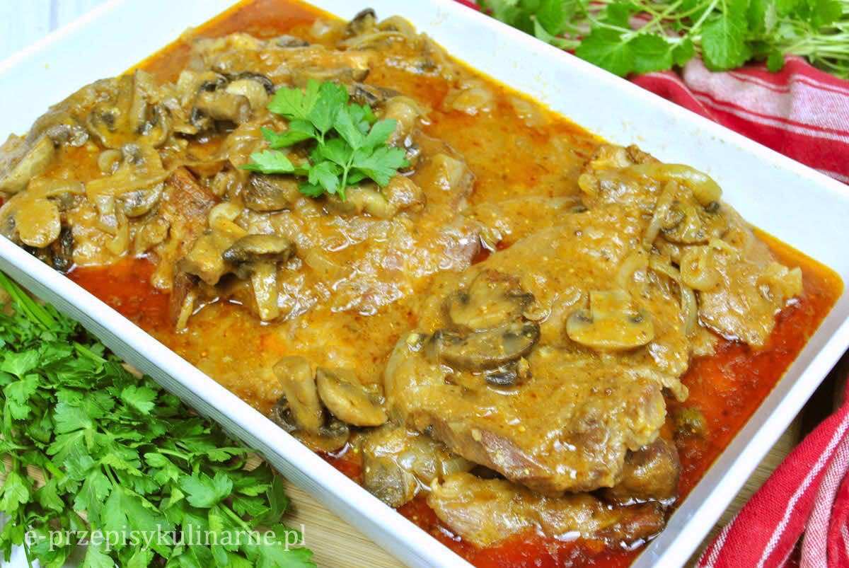 Karkówka z pieczarkami i cebulą pieczona w sosie z dodatkiem musztardy i ketchupu jest pyszna, soczysta i mięciutka – wręcz rozpływa się w ustach. Jest to świetne danie na obiad, imprezę czy świąteczny stół.