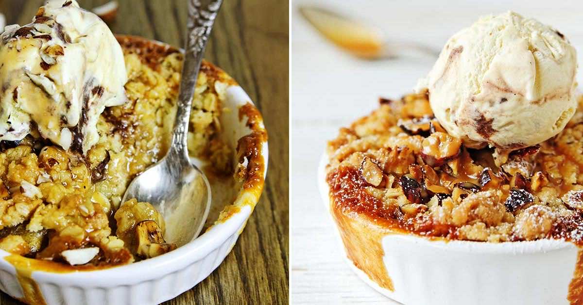 Przepyszne zapiekane skarmelizowane gruszki z kruszonką – idealne do podania na gorąco z lodami.