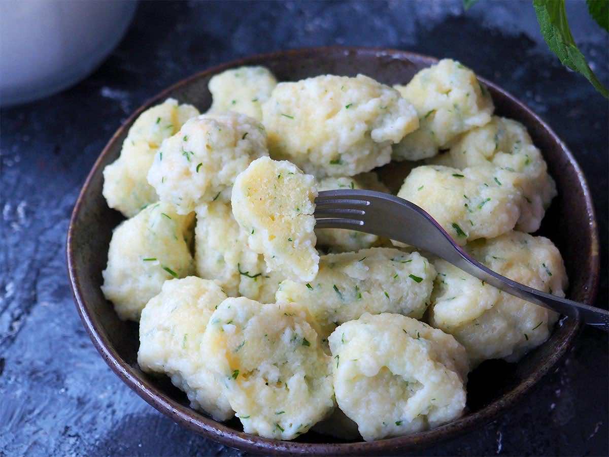 Kluski kładzione łyżką do wrzątku,  z kaszy manny z dodatkiem koperku.