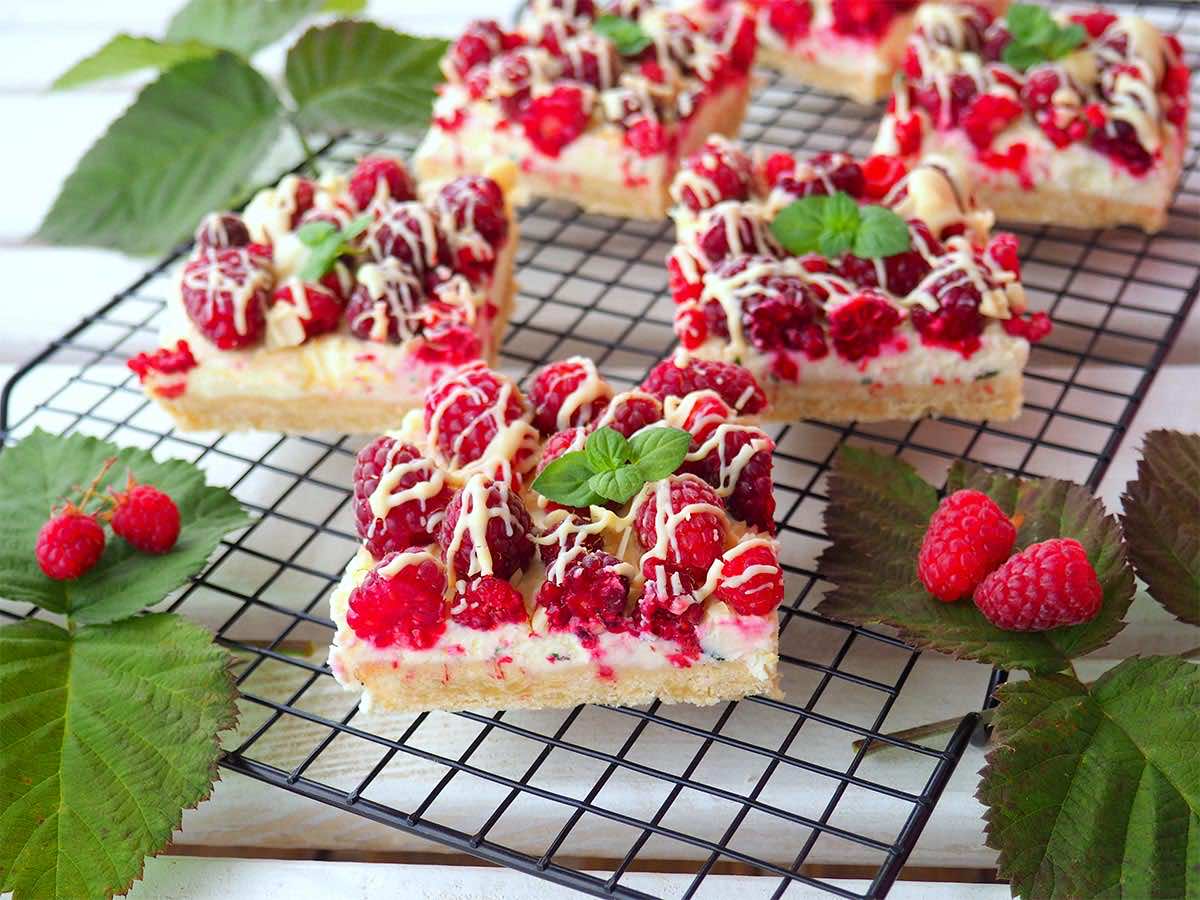 Kruche ciasto z serkiem mascarpone o smaku cytrynowo-miętowym oraz świeżymi malinami i białą czekoladą.