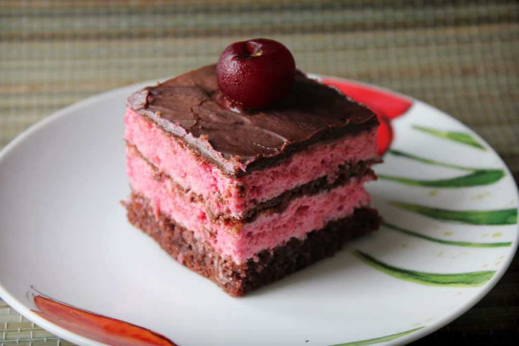 Kostka wiśniowa to przekładane ciasto kakaowymi blatami z kremem z wiśni (poza sezonem można użyć mrożonych). Całość udekorowana jest czekoladowym sosem z dodatkową wiśnią na każdej kostce. Ciasto wyszło pyszne, rozpływające się w ustach. Wiśnie i czekolada to idealne połączenie smakowe.