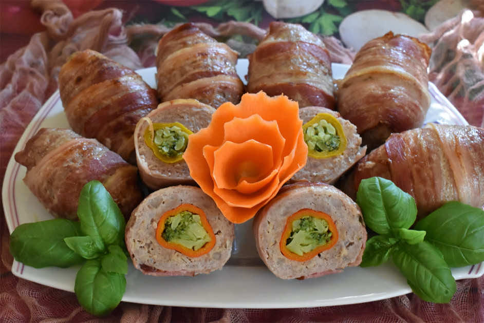 Bajeczne kotlety mielone utulone soczystym aromatycznym boczkiem, faszerowane papryką z brokułem.
