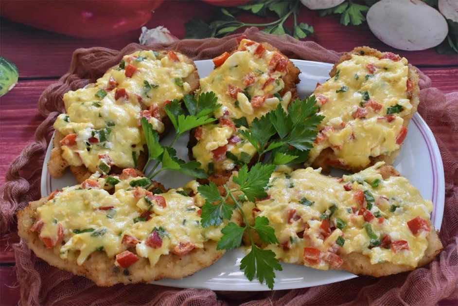 - Następnie układamy farsz warzywno jajeczny na kotletach i zapiekamy w 180 °C do chwili rozpuszczenia się sera.