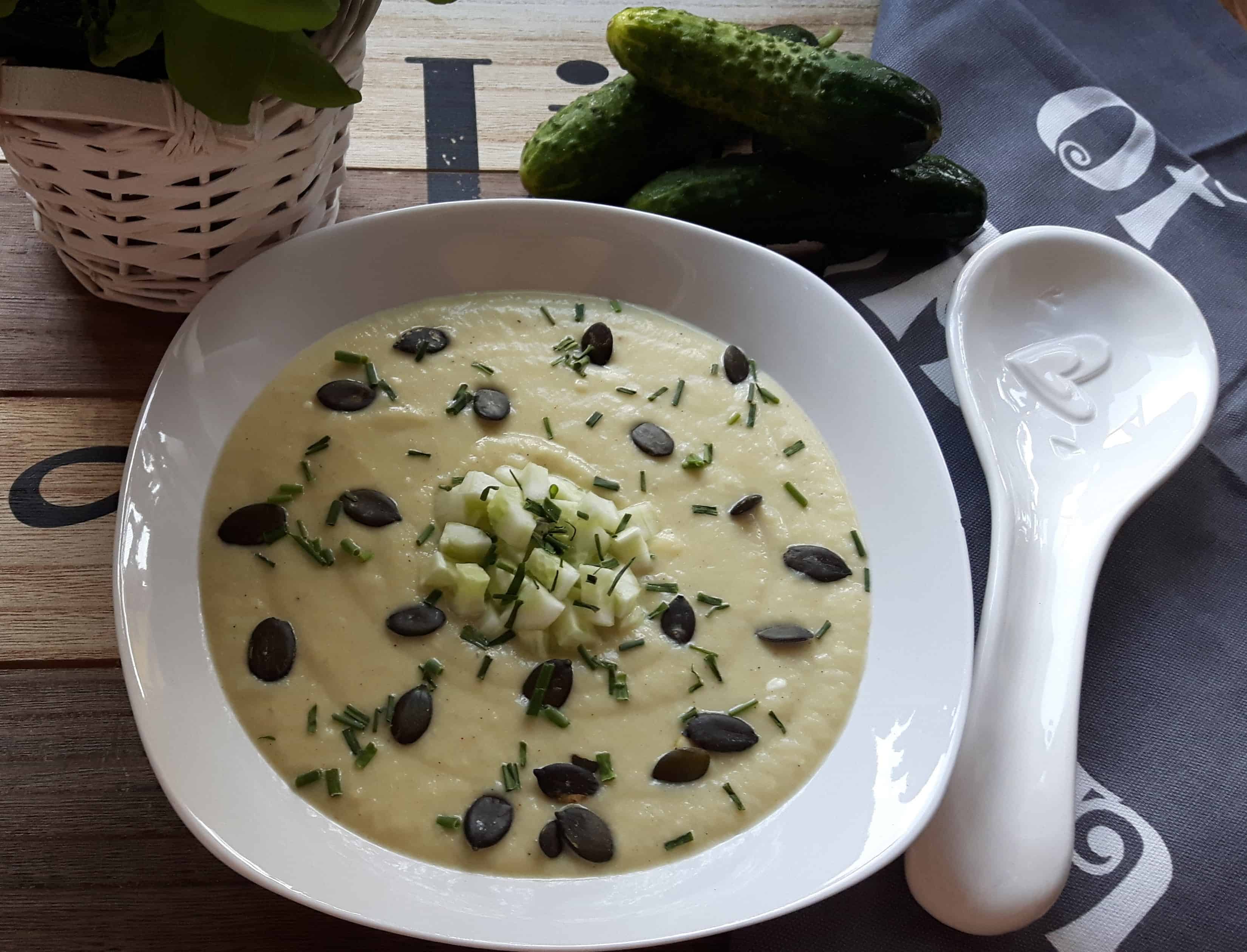 Gęsta i sycąca zupa krem z zielonego ogórka i awokado, podana z pestkami dyni oraz szczypiorkiem.