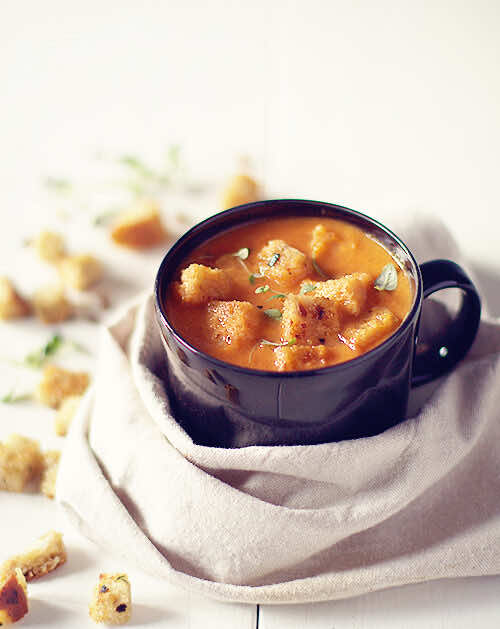 Napełnij kubki gorącym kremem i posyp grzankami i tymiankiem.