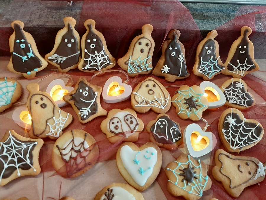 Kruche i bardzo smaczne ciasteczka maślane można nie tylko schrupać zaraz po upieczeniu, ale również udekorować dowolnym motywem. Upiekłam je na Halloween, więc tematem przewodnim były duszki i pajęczyny. Jakoś nie odważyłam się zmierzyć z tzw. paluchami wiedźmy w ramach halloweenowych pychotek :P Może za rok… Tymczasem zapraszam do zapoznania się z wesołą i psotną gromadką duszków i pajączków. Nawet nasze koty postanowiły włączyć się do zabawy i upolować kilka ciasteczek :)