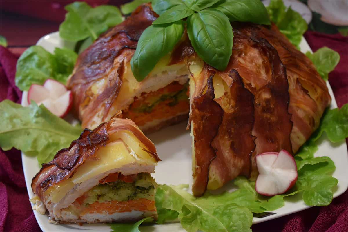 3. Układamy na około naczynia plastry boczku, tak żeby spód był również przykryty i brzegi można zawinąć do góry