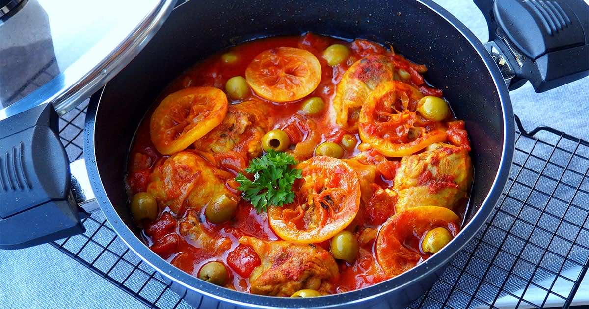 Podudzia z kurczaka zamarynowane w aromatycznych przyprawach kuchni marokańskiej z dodatkiem soku z cytryny, mięty oraz oliwy, a następnie duszone w sosie pomidorowym z dodatkiem cytryny, szafranu i oliwek. Danie to jest niezwykle aromatyczne, a podudzia z kurczaka bardzo soczyste. Tak przygotowanego kurczaka podajemy po marokańsku, czyli z kuskusem.