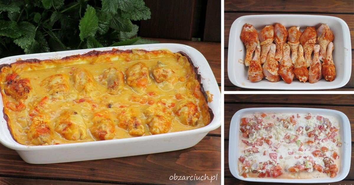 Soczyste podudzia z kurczaka pieczone w sosie czosnkowym z pomidorami, znakomicie sprawdzą się na świąteczny obiad.