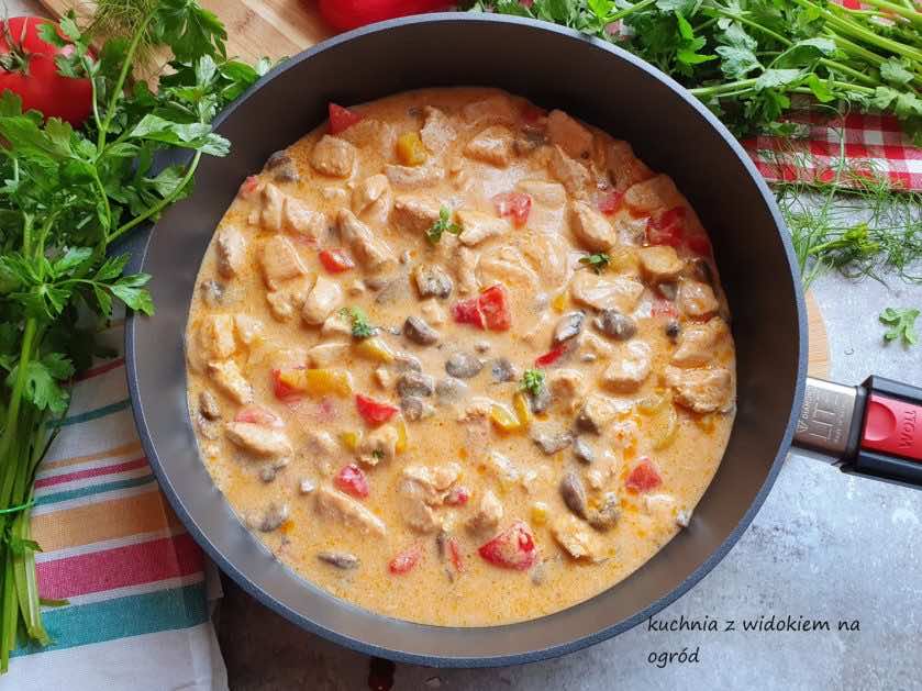 Kurczak w sosie jogurtowym z pieczarkami i papryką