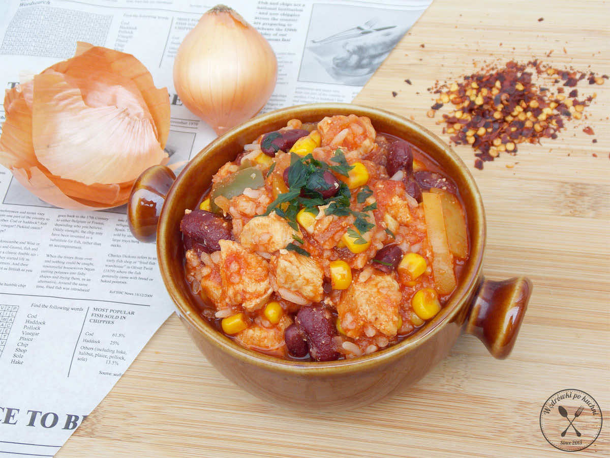 Kuchnia meksykańska to jedna z najpopularniejszych kuchni na świecie i najbardziej urozmaicona. Łączy w sobie elementy kuchni hiszpańskiej i prekolumbijskiej. Słynie z wyraźnego, intensywnego smaku i aromatu, kolorowych dań oraz bogactwa przypraw. Dziś serwuję błyskawiczne, sycące, jednogarnkowe danie w stylu meksykańskim. Soczyste kawałki kurczaka w aromatycznym, pikantnym, pomidorowym sosie. Danie cudownie rozgrzewające, idealne na chłodne, jesienno – zimowe dni.