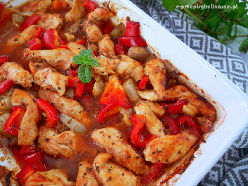 Kurczak zapiekany w ketchupie z pieczarkami i papryką to przepis na bardzo prosty i szybki obiad. Piersi z kurczaka wychodzą soczyste i nieprzesuszone. Danie jest lekkie, smaczne i aromatyczne.