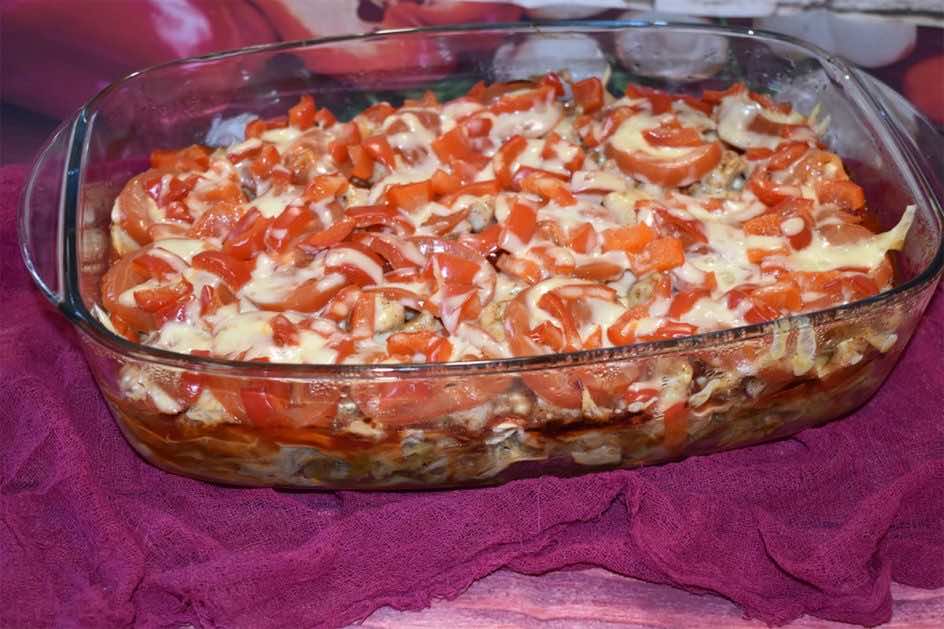 - Ostatnią warstwą jest pozostała połowa mięsa oraz pokrojone warzywa, pomidory w plasterki a papryka w paseczki