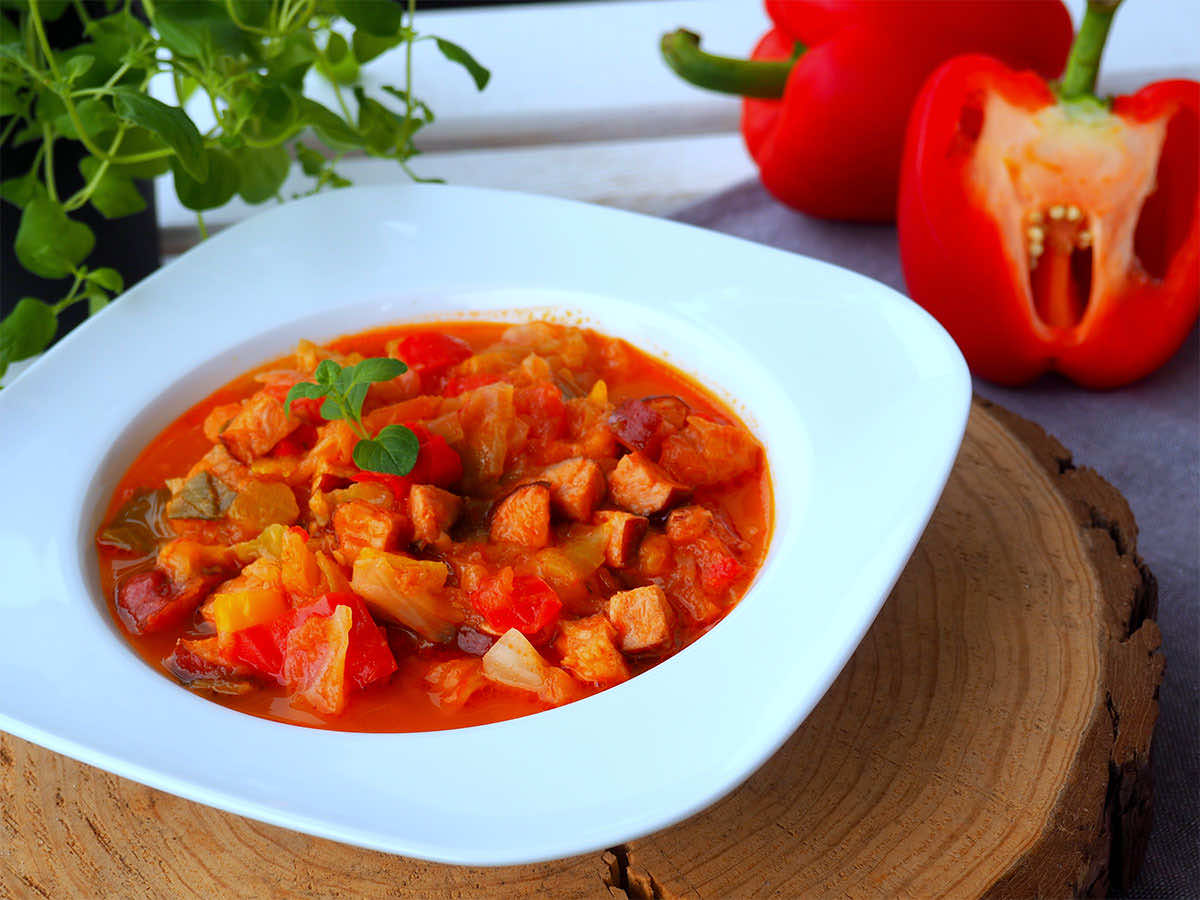 Leczo w wersji spolszczonej … z dodatkiem cukinii oraz młodej kapusty. Pyszne danie jednogarnkowe, pełne warzyw sezonowych.