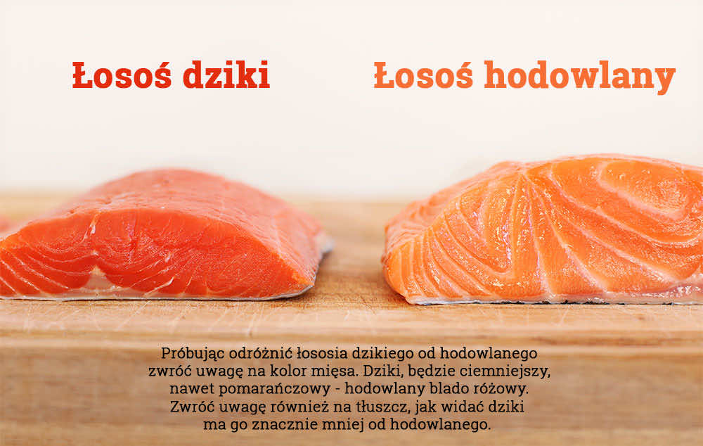 Zanim kupicie łososia warto też zwrócić uwagę na jedną rzecz i kupić łososia dzikiego, a nie hodowlanego. Jednym z wyznaczników jest oczywiście cena. Łosoś dziki jest droższy od tego hodowanego w dużych skupiskach i leczonego antybiotykami. Oprócz ceny warto zwrócić uwagę na wygląd mięsa. Poniżej znajduje się grafika, która pomoże Wam wybrać odpowiednie mięso.