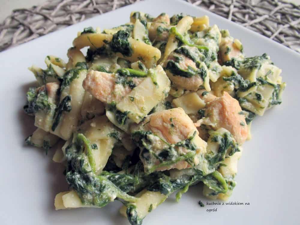 Makaron z kurczakiem, szpinakiem i serem feta.