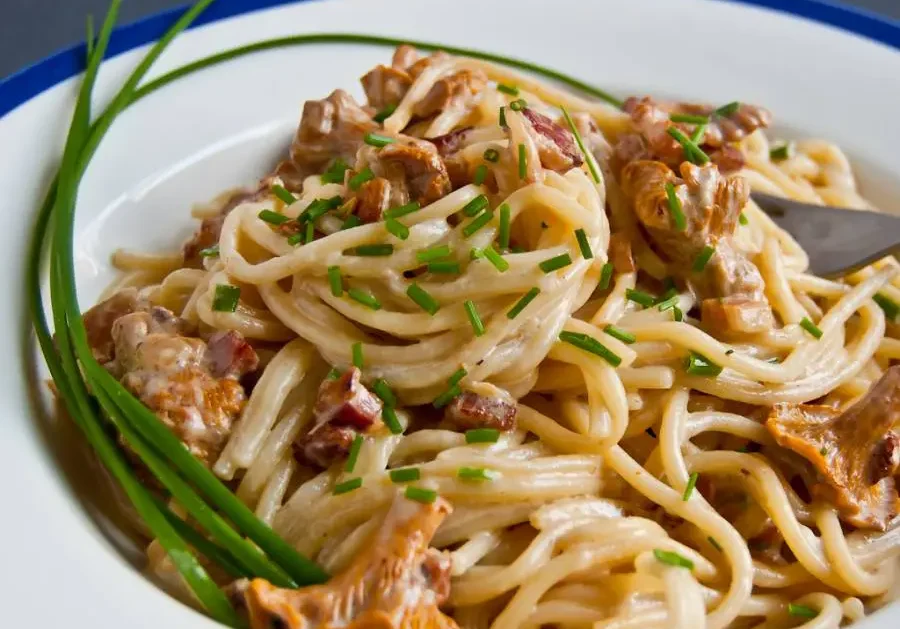 Przepis na makaron z kurkami na bazie przepisu na spaghetti carbonara. Szybka propozycja na smaczny obiad.